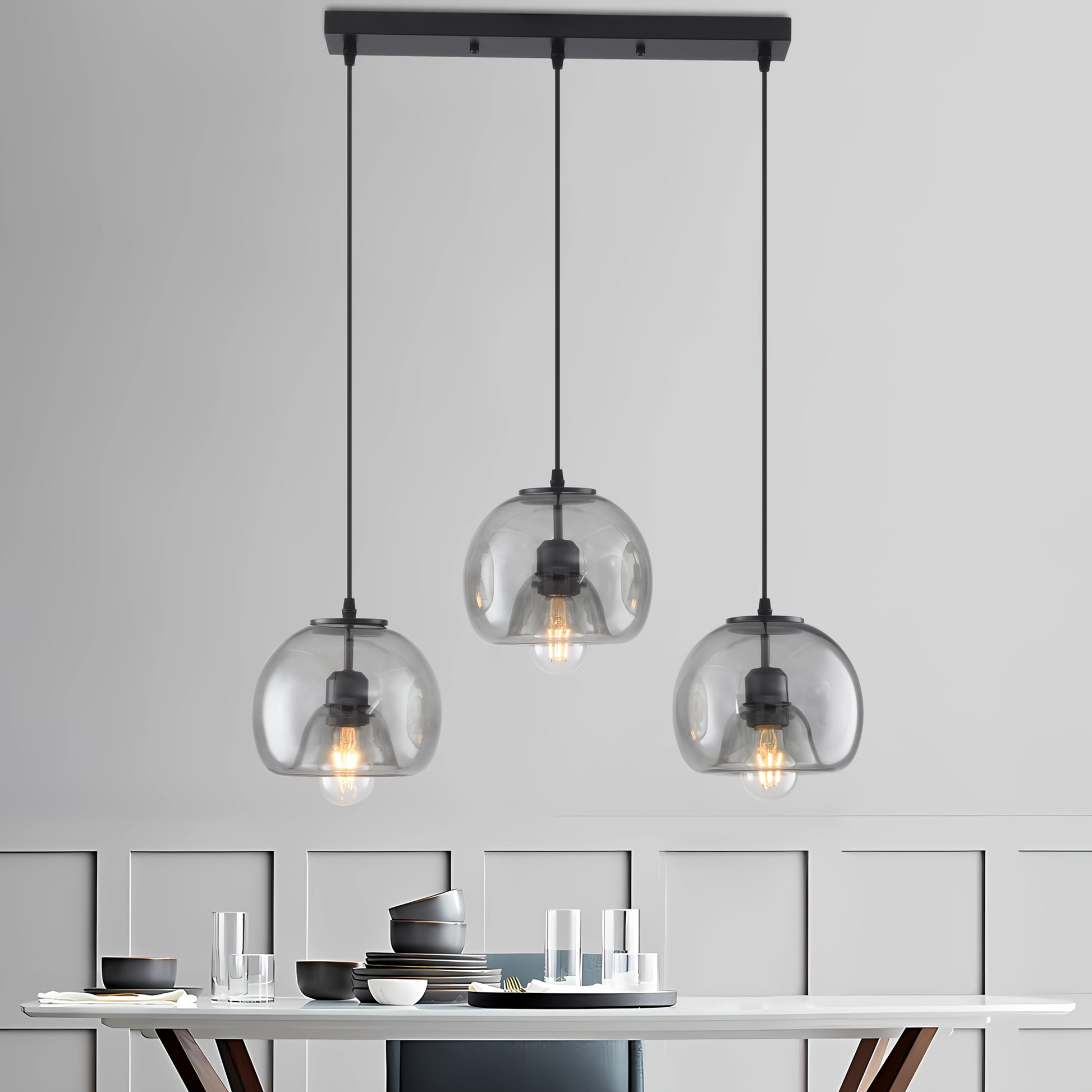 Upgrade your dining area or kitchen island with this contemporary 3-light pendant lamp. Featuring smoked glass shades and an adjustable suspension, it combines style and functionality to create a warm and inviting atmosphere. Perfect for modern dining rooms, kitchens, or bar spaces, this pendant light adds a touch of sophistication to any interior.